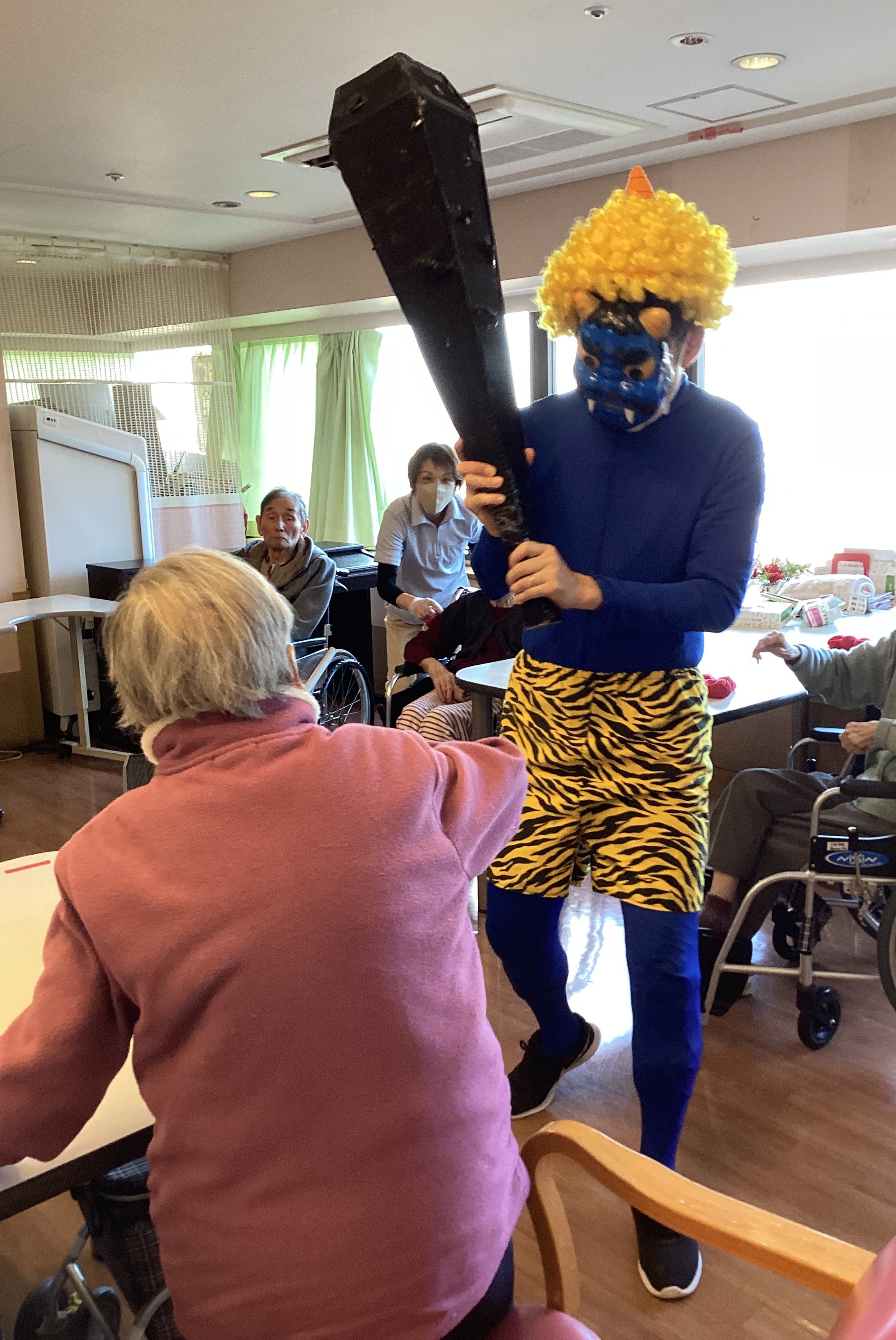 節分 年間行事 2026年02月10日 0 令和8年2月1日(日)利用者様の無病息災を願い、恒例の節分豆まきを行いました。鬼に扮装する職員に向かって、豆の代わりに紅白玉を投げていただき、鬼を追い払いました。